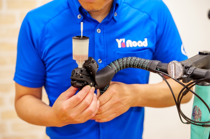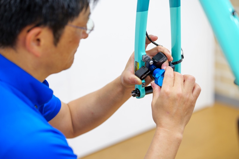 油圧式ディスクブレーキでは、油圧システム内からエアを除去するため、メーカーマニュアルに準じた作業を行うと共に、型式によるクセを考慮した手順を追加したり、あえて日を置いてエアをシステム上部に移動させるなどのひと手間を加え、油圧ならではのカッチリとしたタッチで安全にブレーキングができるよう調整しています。