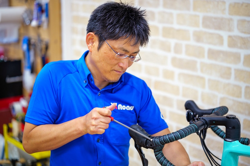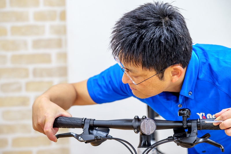 メーカーからの納品状態では、左右の角度がまちまちだったり、そもそも快適に自転車を操作できる標準的な設定範囲から外れていることも多いため、人間工学的に扱いやすいニュートラルな位置に設定し直しています。