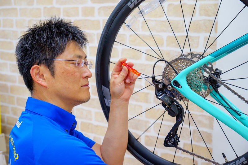 フロントディレーラーなら角度・高さの緻密な設定、リアディレーラーならBテンションの調整、フロント・リアディレーラー共に可動範囲の調整、機械式の場合はワイヤーの初期伸び取り・ワイヤーテンションの調整など、「ただ動く」「何となく変速している」だけではない、メーカーが想定しているベストな性能を引き出すため、ミリ単位のセッティングを行っています。