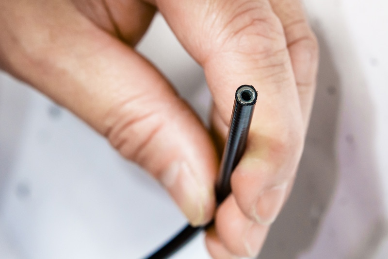 外からは見えない下処理にもこだわり、機械式ブレーキのアウターワイヤーでは、ヤスリやグラインダーで端面を平滑に仕上げ、点ではなく面でブレーキ力を受け止められるようにしています。